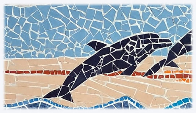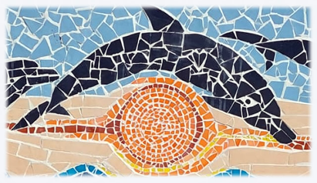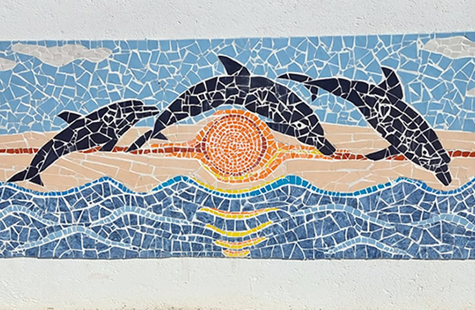 O mural três golfinhos transporta-nos para o calor do sol, para a ondulação suave do mar e ainda para a brincadeira alegre de três pequenos golfinhos.