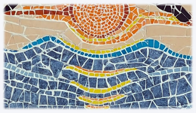 Para evidenciar a beleza deste painel em mosaico partido, foram utilizadas diferentes dimensões e distintas direções na orientação dos pequenos bocados de mosaico aplicados.