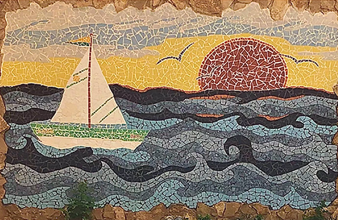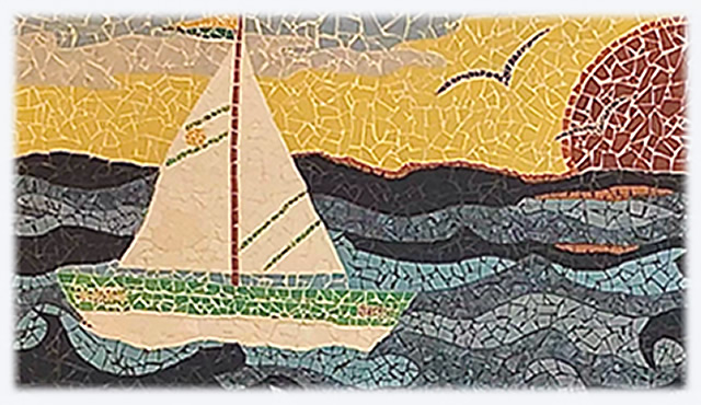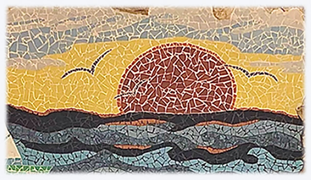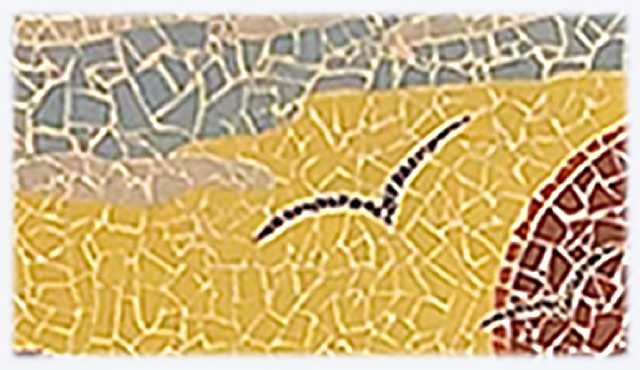 A maneira como se conseguiu cruzar, quer as áreas definidas de ondas de cor diferentes, quer as áreas de céu e nuvens, assim como as gaivotas nas cores do céu, fazem deste painel em mosaico partido uma maravilhosa obra de arte.