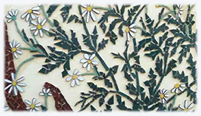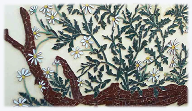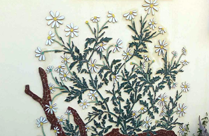 O mural "Malmequeres" é uma criação em mosaico partido que combina as cores castanho, verde, branco e amarelo. O design deste mural pretende reproduzir uma planta exuberante de um malmequer florido que é apoiado por um belo tronco velho.