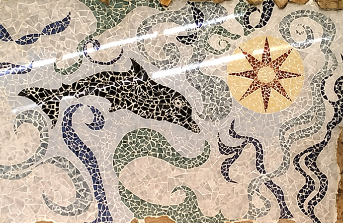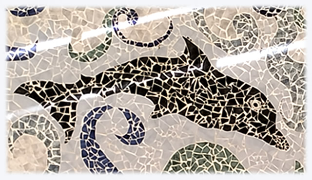 No mural "Um Golfinho" podemos imaginar um movimento quase real das ondas e das correntes marinhas. Estas rodeiam-no e procuram acariciá-lo enquanto o golfinho procura brincar com elas.