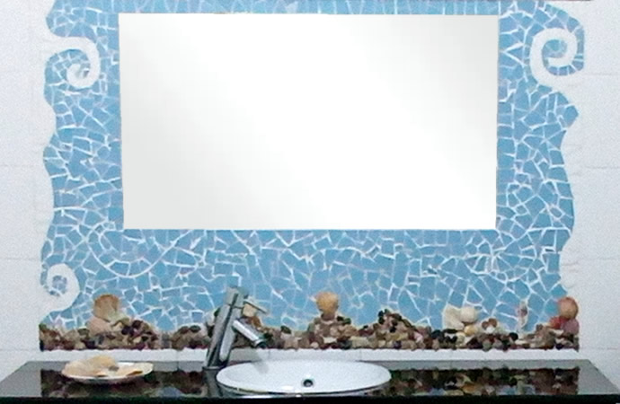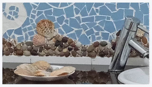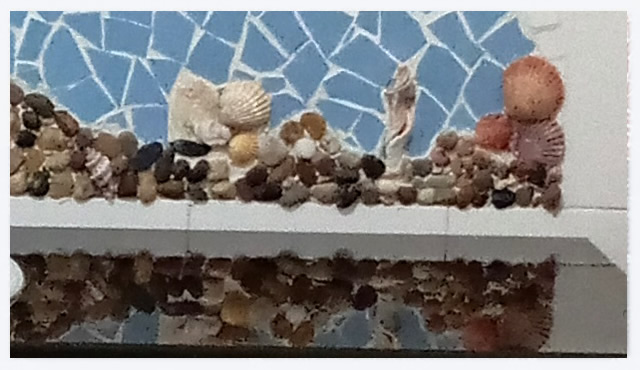 Combinação de mosaico partido com conchas, pedras e búzios.